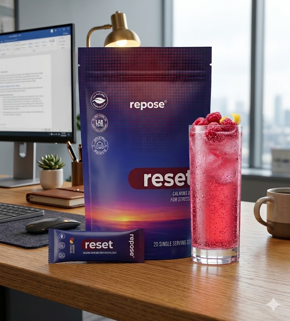Reset is a calming adaptogenic drink mix by Repose. Mix one sachet with cold water after work and feel the mental noise clear. It's designed to help you transition out of the stress of the day — lowering cortisol, quieting mental chatter, and preparing your body for proper rest. No alcohol, no melatonin, no grogginess.