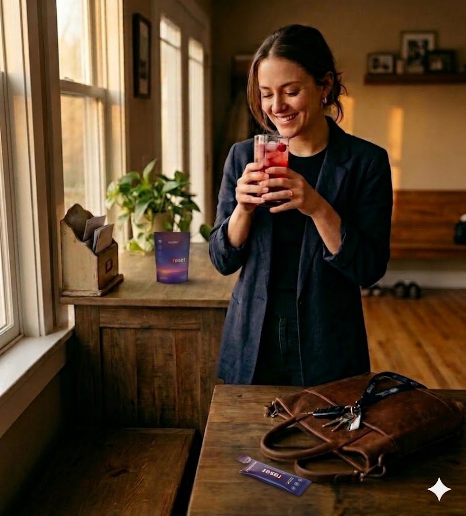 Reset tastes the way the end of a long day should feel — bright and clean, without being sharp. A natural raspberry softness leads, followed by a quiet citrus lift that fades gently. No chalky aftertaste. No artificial sweetness that lingers. Just a clean glass of something that signals: you're done for the day.